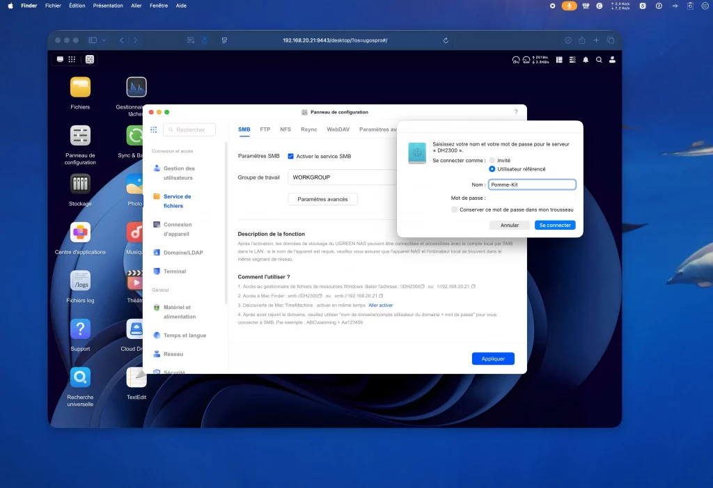 Ensuite, sur Mac par exemple, on se sélectionne depuis le Finder, dans le menu « Aller », « Se connecter au serveur », puis on renseigne l’adresse, l’identifiant et le mot de passe de son compte sur le NAS, et la ressource apparait dans le Finder. On peut y gérer ses fichiers directement. Si un dossier partagé a été créé, il apparaitra également.