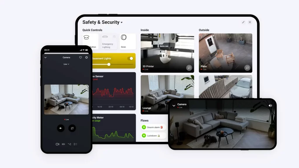 Maintenant il va enfin être possible de visionner directement ses caméras dans les applications Homey. On pourra par exemple se construire son tableau de bord « Sécurité » et voir d’un coup d’oeil toutes ses caméras.