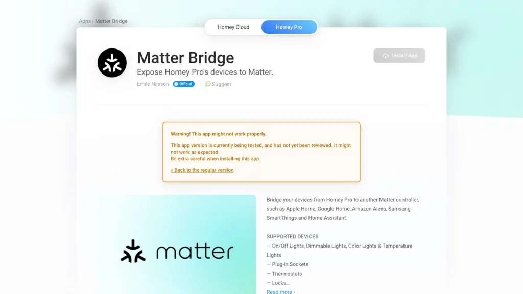 C’est une nouveauté qui pourrait bien changer pas mal de choses. Homey a créé une nouvelle app (actuellement en bêta à l’heure où j’écris cet article) qui va permettre d’exposer à Matter des accessoires connectés à la box Homey Pro.