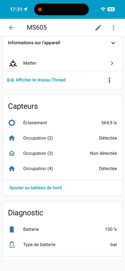 Une fois que l’accessoire a été ajouté, on va retrouver l’éclairement et les trois capteurs d’occupation, ainsi que le niveau de batterie.