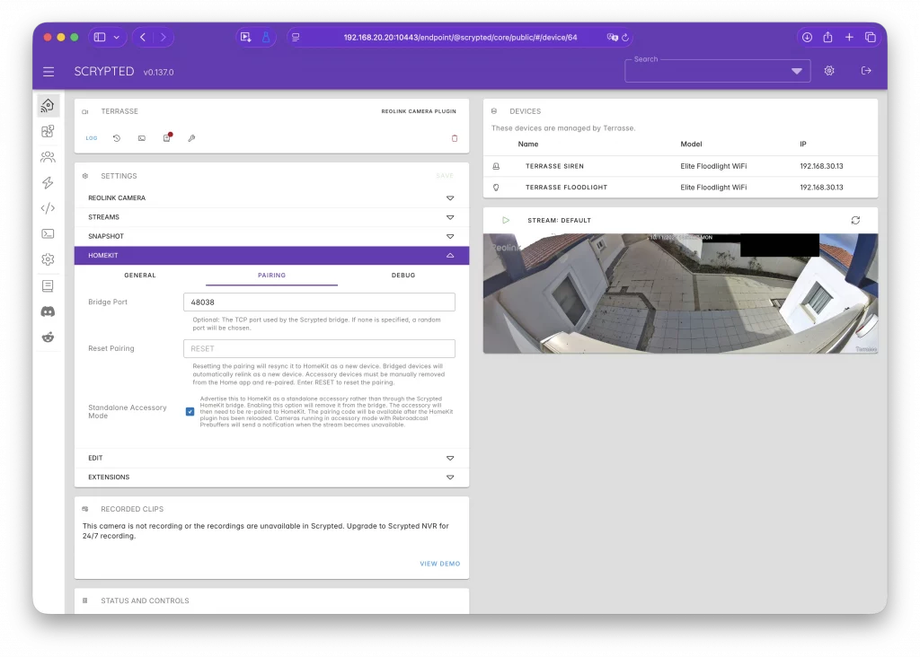 Cette caméra n’est pas nativement compatible HomeKit, et encore moins HomeKit Secure Video. Cependant, il est possible d’utiliser cette caméra dans HomeKit grâce à l’application Scrypted.
