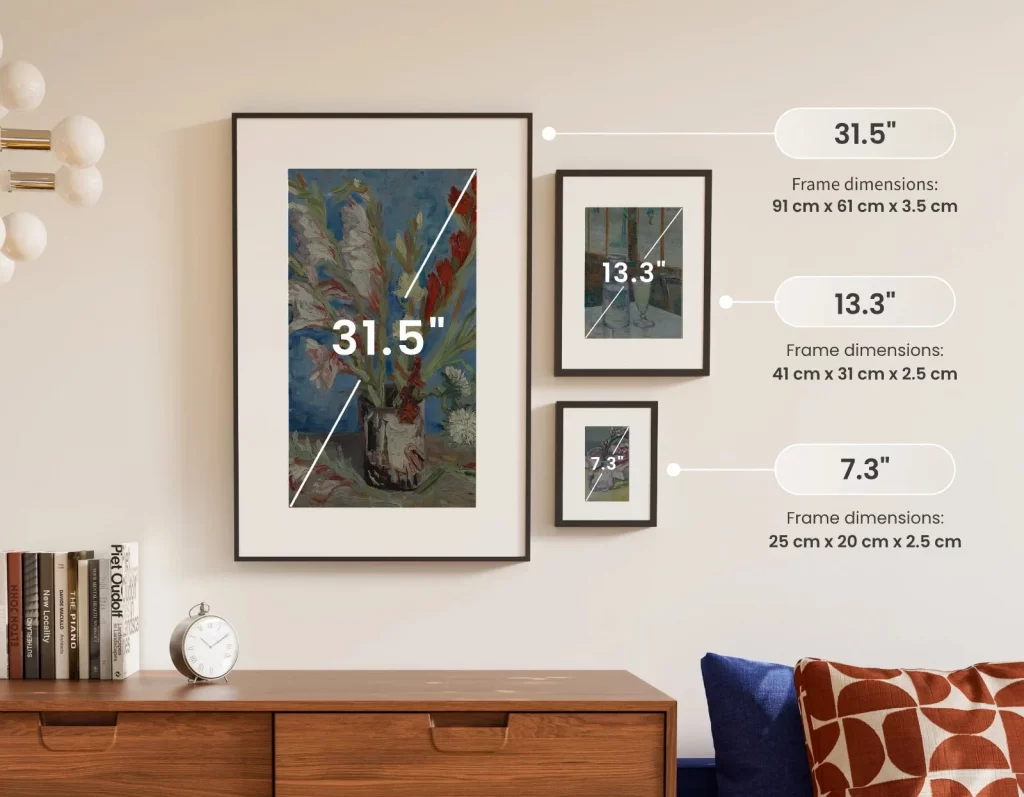 Les cadres sont disponibles en 3 tailles : 7,3″ (à peu près la taille d’un iPhone), 13,3″ (à peu près la taille d’un iPad) et 31,5″.